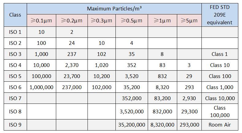 | Class | Maximum Particles/m³ | FED STD 209E equivalent | |||||